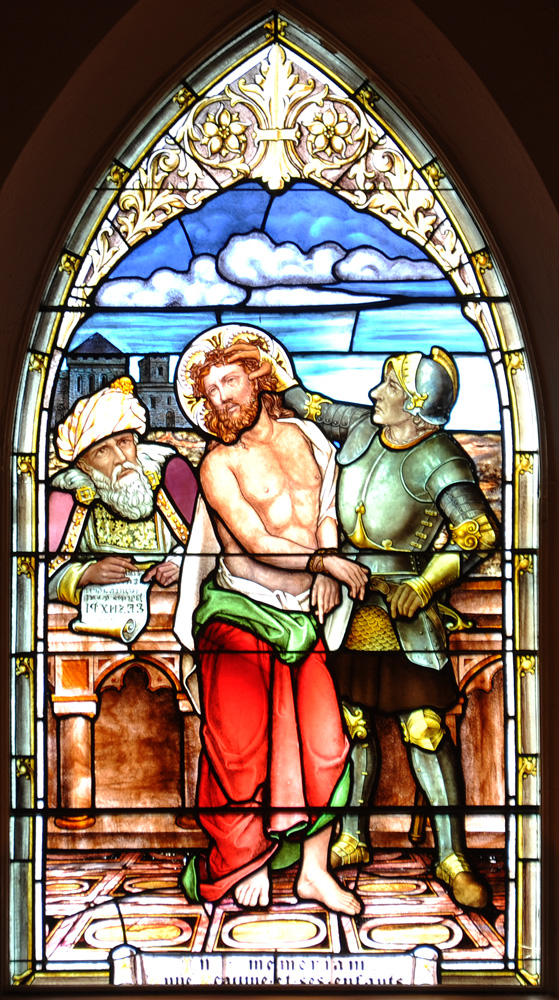 The image appears to collapse the actual arraignment of Jesus before Sanhedrin (represented by the man at left) and the beating he then received from their servants. The window is the third of three in the sacristy (apse) that present the Passion of Christ (see below).