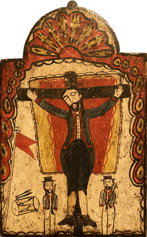 This is the St. Acathius who led the ten thousand soldiers who were martyred for their faith, crucified on trees by order of the Emperors Hadrian and Antoninus. Because of the trees in the story the saint's attribute is usually a leafy branch, but in this case he is pictured like Christ, on a cross with his head drooping to the right. At the foot of the cross are his two companions, Eliades and Carterius, like Acathius in contemporary dress. Their status as soldiers is expressed by their rifles and by the drum and military standard in the lower left.