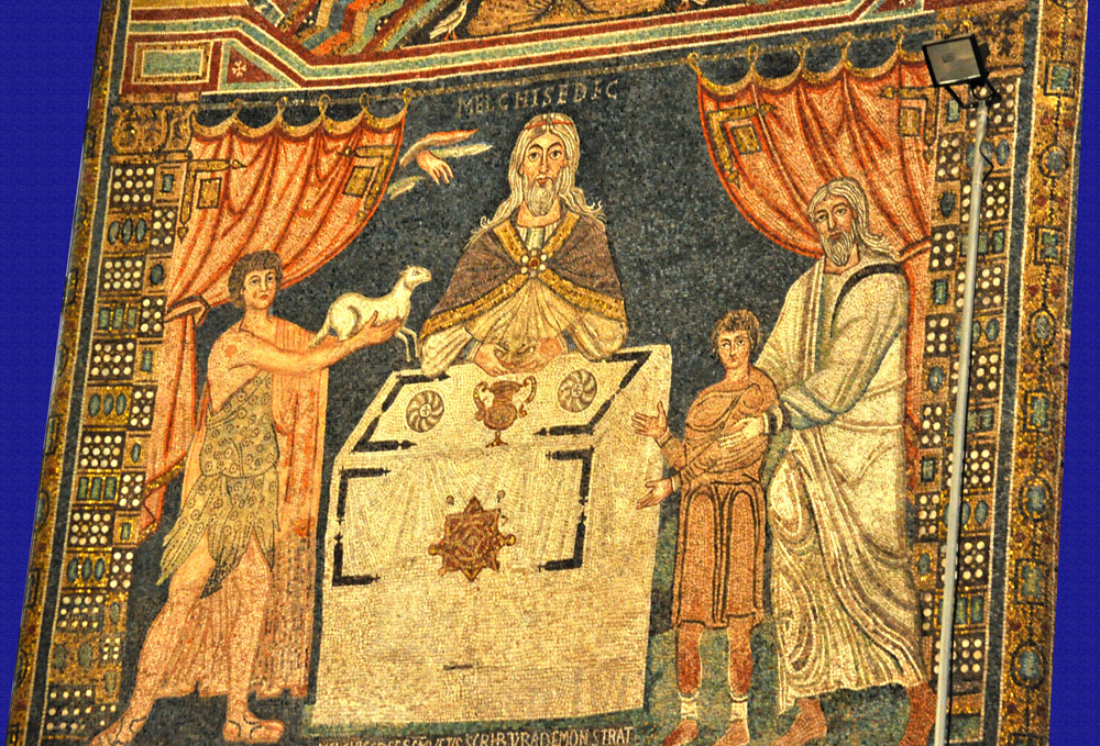Abel offers a lamb, Melchizedek bread and wine, and Abraham his own son, Isaac. All three offerings are traditionally taken as types of Christ, the victim offered on the Cross and in the sacred liturgy. As at San Vitale, the wine on the altar is in a kantharos, a symbol of resurrection/immortality seen in images related to Christian baptism. (See the page on those images.)