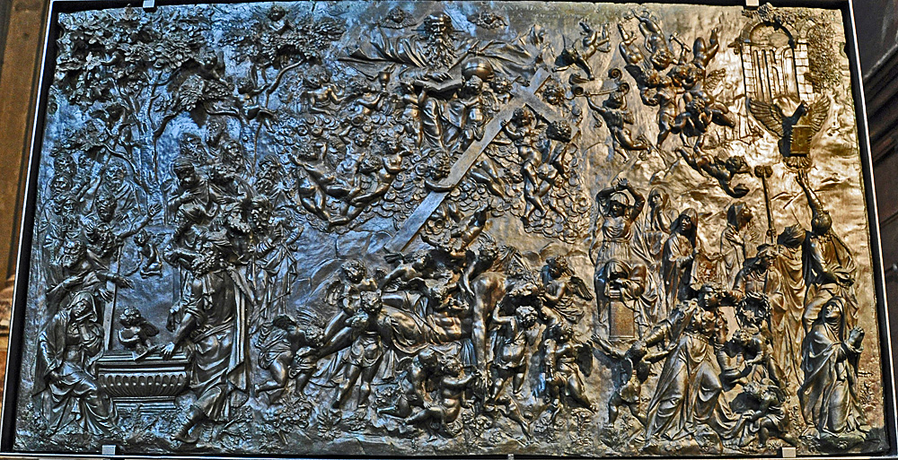 receives the cross by which his son has expiated the sins of mankind. His right hand points to a passage in a book while his left arm cradles the mappa mundi that signifies his rule over the earth.