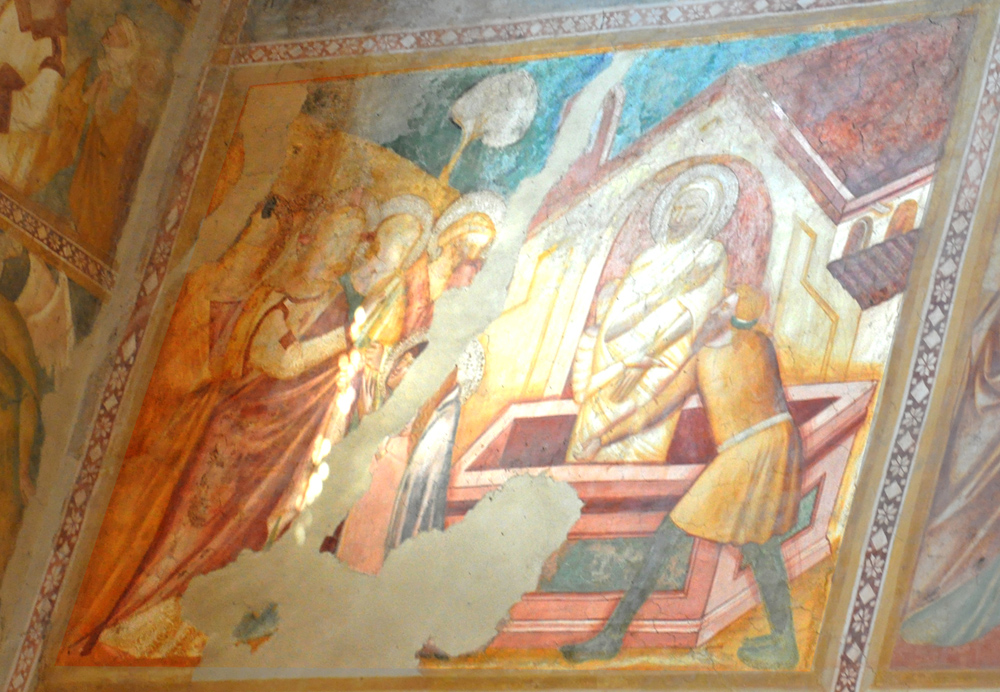 The fresco illustrates John 11:1-44. Martha and Mary, much obscured by the flaking of the plaster, kneel at the feet of Jesus, who gestures toward Lazarus. It is hard to tell whether his hand is holding a wand (as in the ancient version of this iconographic type) or in blessing configuration (as in the "modern" version).
