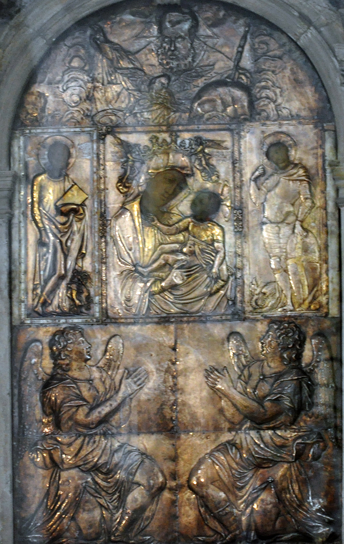 Above the Virgin and Child are God the Father and the dove representing the Holy Spirit. The dove seems to be holding something like twigs or sticks in its feet.