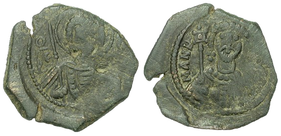 Reverse: MANYH ΔΕCΠΟΤ, bust of Manuel I Comnenus facing, wearing crown and loros, labarum in right, globus cruciger in left.