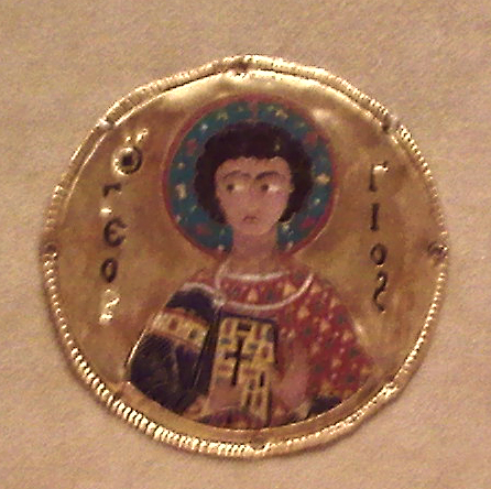 As in many other portraits from the first millenium, St. George is shown holding a hand cross.