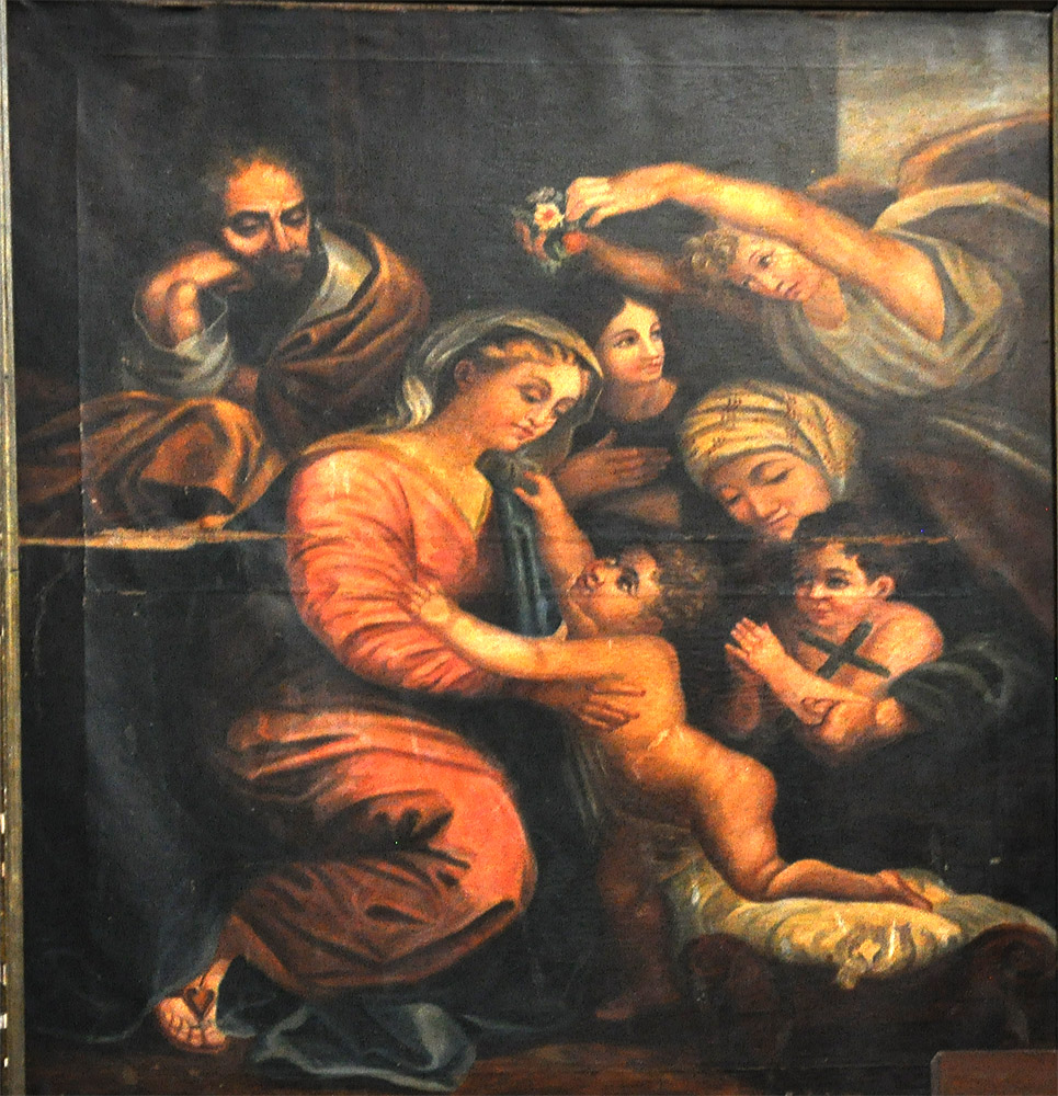 The picture follows the post-Tridentine imagery in which Joseph is a man in vigorous middle age, illuminated nearly as fully as Mary and the baby. The angel bringing Mary the chaplet of flowers is an unusual detail, as is the unidentified young woman in the background.