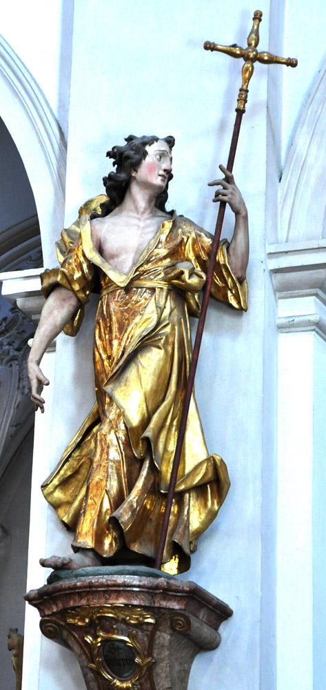 This is one of twelve Apostle statues in the nave of the church. A tall cross is St. Philip's usual attribute. He is also identified by the inscription below the podium.