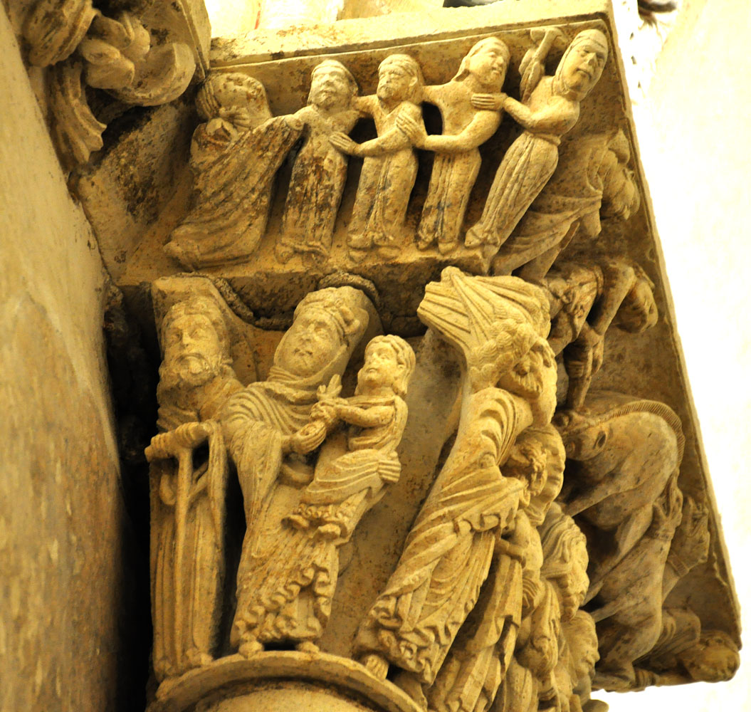 On the right an accuser takes the adulteress before Jesus (John 8:3-11). His right hand points to the law that demands her death, but Jesus' right hand reaches out to protect her. The figure of Jesus is shared by this grouping and the one on the right face of the capital, which depicts the Harrowing of Hell (see below).