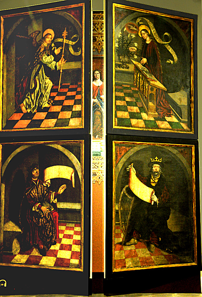 These are the lower panels of the doors covering the St. Catherine Altarpiece. Unfortunately, the words on the scrolls have faded away (or perhaps been scratched off). But it was traditional to see a prophecy of the Annunciation and the Nativity in Isaiah's words to Achaz, "Behold a virgin shall conceive, and bear a son, and his name shall be called Emmanuel" (Isaiah 7:14). A large number of passages from the Psalms (attributed to David) were considered similarly prophetic.