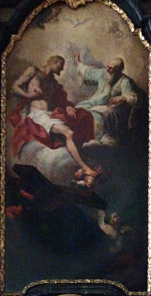 Angels lift up the cross while Christ points to the wound in his side, an indication of the sacrificial death by which he has atoned for the sins of mankind. The Holy Spirit above completes the by now traditional iconography of the Trinity.