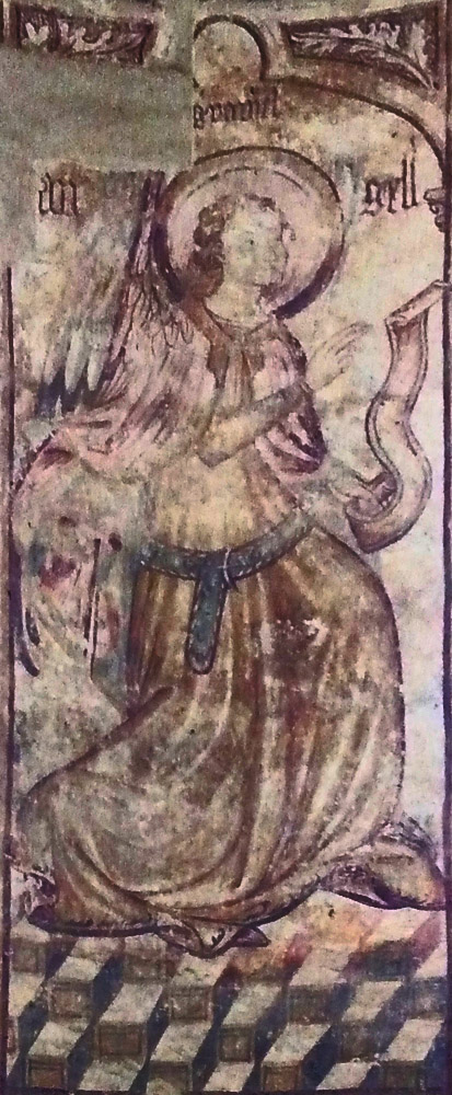 The word above the angel's head is an oddly rendered Gabriel. The piled-brick design on the "floor" beneath him is repeated in other frescos throughout the apse.