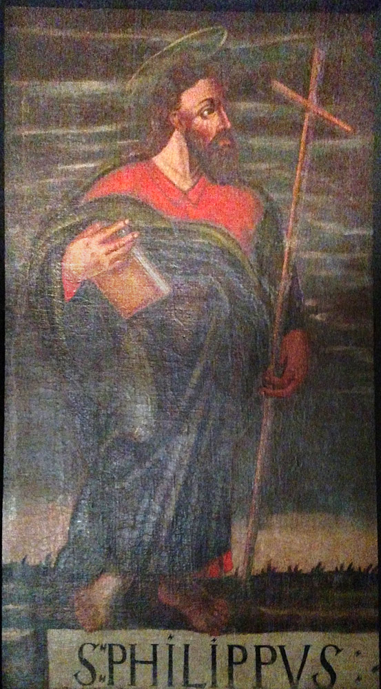 St. Philip's attribute is the long cross. The book is seen only occasionally in Philip's portraits. This painting is one of a set of portraits of the Apostles that line the sides and back of the nave.