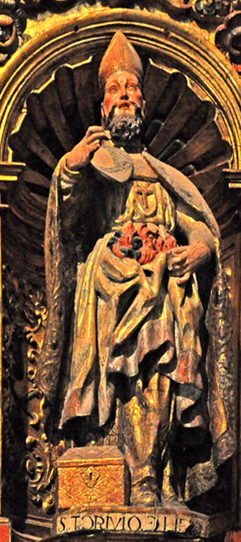 The inscription on the pedestal of the statue incorrectly identifies the saint as Turibius of Liébana, a monk who lived in the following century.