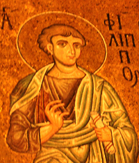 St. Philip: Detail from a Byzantine-style mosaic in Monreale Cathedral, Sicily. (See the description page.) ATTRIBUTES