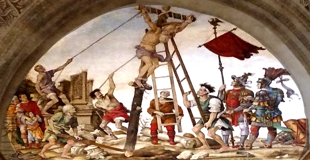 According to most of the legends St. Philip was crucified by pagans in the city of Hierapolis in Phrygia. One of the legends Acta Sanctorum says an earthquake followed the saint's death (May vol. 1, 14). That may be the point of the broken columns in the fresco.