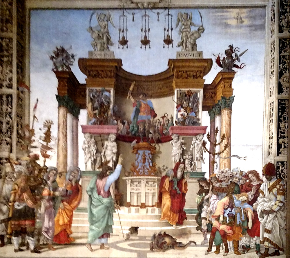 The creature sitting on the circle on the floor is the dragon whose breath has been sickening the people of "Scythia," which the legends seem to assume is a city rather than a region. On the left a woman holds her nose against the stench. On the right the pagan priest reacts in horror at the death of his son (the blond boy with the blue mantle and red hose). In the center St. Philip declares, "Believe ye me and break this idol and set in his place the cross of Jesu Christ and after, worship ye it, and they that be here dead shall revive, and all the sick people shall be made whole" (Golden Legend #65). In the legend, the people do just that and all are cured and converted to "the faith of Jesu Christ."