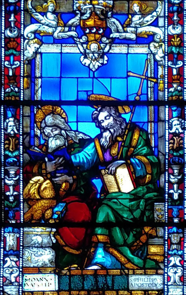 St. John the Evangelist is on the left; before him is the eagle that is his symbol. On the right, Philip carries the long cross that is often used as his attribute. He reaches over into John's book. In the other gospels Philip is mentioned only in lists of the Apostles. But in John he appears as an actor in the episode of his and Nathanael's induction into that group (1:43-48), in the story of feeding the five thousand (6:5-12), and in his reporting to Jesus about the Greeks who wanted to see him (12:20-22).