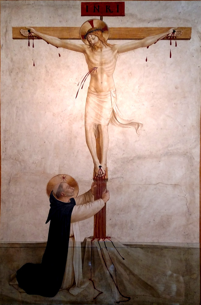 The star above Dominic's forehead is a common attribute of this saint, and the color it shares with the blood spurting from Christ's side above him makes an eloquent comment on the source of one's sanctity.