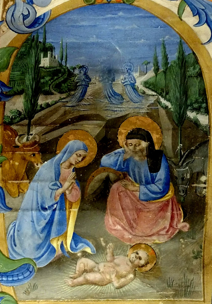 The great majority of Nativity images place the birth in either a cave or a stylized stable, but here the artists have adopted neither setting, although the viewer could imagine a cave in the hill behind the family.