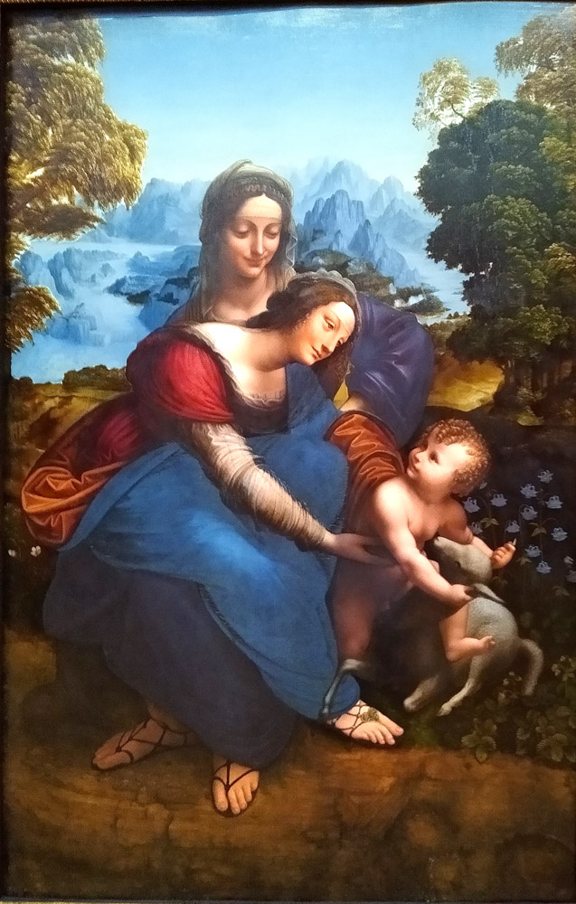This is a more animated variation on the Anna Selbdritt iconographic type, in which Mary sits on Anne's lap and the child Jesus sits on Mary's. Just at the time when the St. Anne's portraits were making her older, this artist (possibly da Vinci's student Salai) makes her seem almost a young as her daughter.