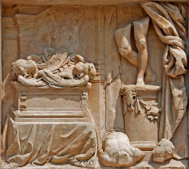 This relief is among four panels flanking the main door of the cathedral that reference the New Testament and the Virgin Mary, traditionally known as the "Ark of the New Covenant."1In I Samuel 5:1-5 the power of the Ark of the (Old) Covenant is demonstrated when the Philistines capture it, bring it to Ashdod, and place it in their temple next to an idol of Dagon. The next morning they find the idol on the floor. They put it back up, but the following morning half the statue lies in pieces on the floor.