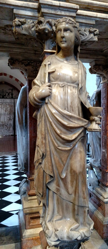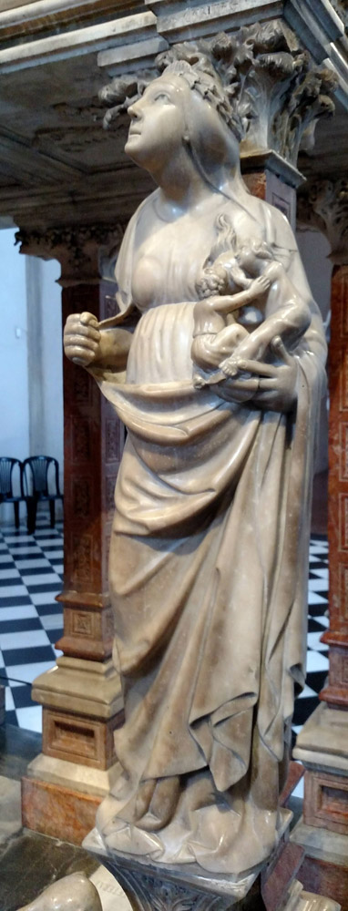 Obedience has a closed book; Hope, a garland of flowers; Faith, a cross and chalice. Charity is pictured in the traditional manner, with a child nursing at her breast. In addition, each Virtue has an appropriate pair of animals sculpted in front of her pedestal (not shown): oxen for Obedience, eagles for Hope, dragons clutching serpents for Faith, and dogs for Charity.