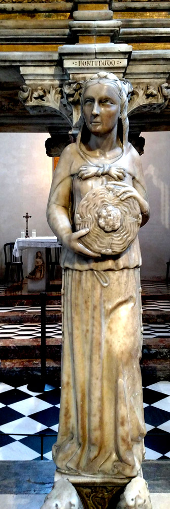 Fortitude has a shield. Many images of this virtue do give her military armor or equipment of various kinds. At her feet is a pair of lions.