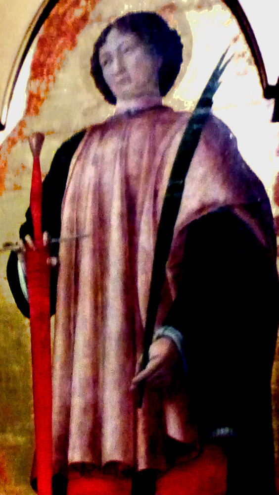 This painting follows the traditional iconography of St. Julian the Hospitaller: a young noble holding a wrapped sword upside-down. The one anomaly is the palm branch, which is due to a confusion with the martyr St. Julian of Auvergne.