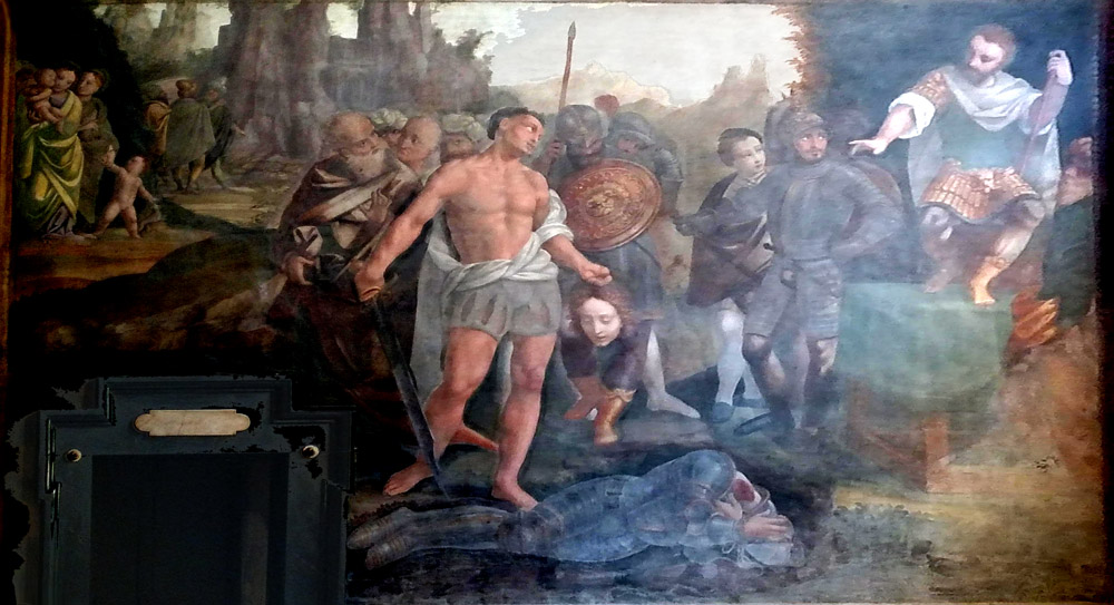From his exalted throne, the prefect Dacian orders the beheading of St. George. In the Golden Legend the saint had changed his military dress for that of "a Christian man" well before his martyrdom, but in this painting he is clad in armor from shoulder to toe, just like the pagan soldiers in attendance. As in the painting on the facing wall, George's shield has a generic design rather than the more traditional red cross on a white field.