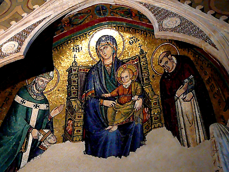 The figuring of the Madonna and Child is an adaptation of the "Virgin Hodegetria" type, which however does not usually involve a throne.