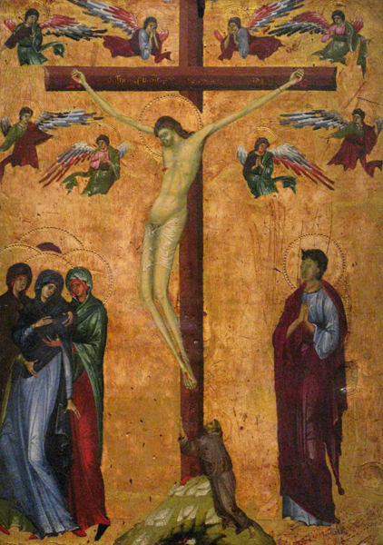 St. Francis hugs the base of the cross in an emotional attitude similar to that of Mary Magdalene in many Crucifixions of the era. The painting is an example of the 13th century's emphasis on pathos in considering the Crucifixion. Jesus' head sags upon his chest and his arms stretch thin under his weight. His humanity and the ignominy visited upon it are declared by the penis visible behind the gauzy cloth. Mary's companions hold her up as her knees flex as if she were about to faint.