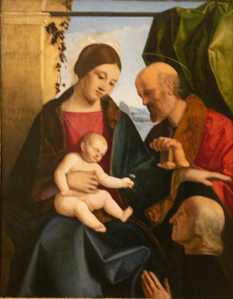 Mary is dressed as usual in her red robe and blue mantle. The baby is naked, an artistic choice that originated in the 15th century. St. Joseph holds a small book or tablet in his disproportionately large left hand.