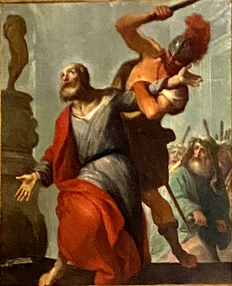 The painting uses the fire from the Golden Legend, which was not in Metaphrastes, and the beating, which was not in the Golden Legend.