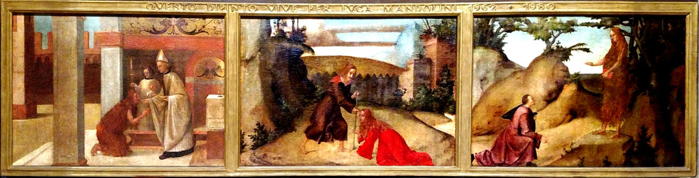 The center panel of the predella is the noli me tangere (John 20:17). The right panel draws on the iconography of St. Mary of Egypt, holding a book and covered only by hair. The man kneeling before her would then be Zosimus. Either the artist was including the Egyptian Mary in the Magdalene's altarpiece because both were reformed sinners, or he was simply getting the two Marys confused. The latter supposition seems more likely, because the woman covered with hair in the left panel is surely the Magdalene receiving communion from Maximin, a common subject.