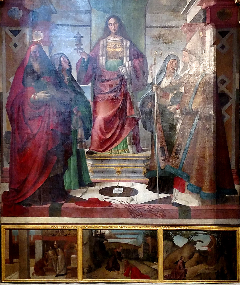 The oil jar in her right hand is St. Mary Magdalene's attribute. The other women saints are identified primarily by the men at their side. Thus on the left are Jerome (red cape and cardinal's hat) and Paula; and on the right are Augustine (wearing elaborate pontificals) and Monica.