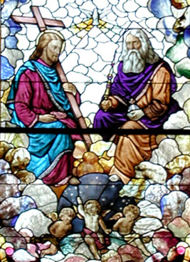 This appears to picture the saint's welcome into Heaven rather than the vision of Christ and his cross that he had during his lifetime. The three "persons" of the Trinity are arranged as in the Trinity iconography that was becoming standard at the time (at right).