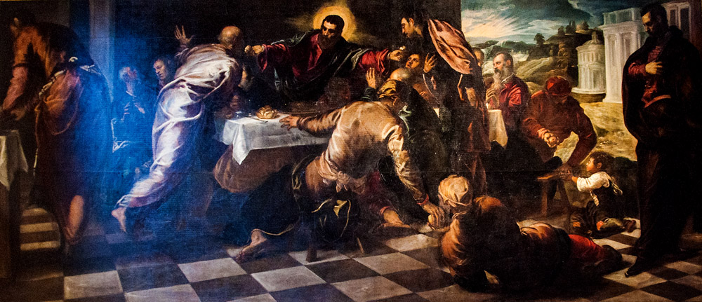 Tintoretto departs from the tradition of modeling Jesus' distribution of the bread on medieval communion liturgy. Instead, the Eucharistic import of this event is carried by the Apostles in the foreground who share their food with a poor man and his child, who lie stretched on the floor much like the sick people whom Jesus cures in other paintings.