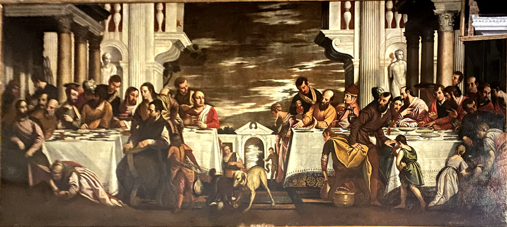 As in Luke 7:36-50, the "sinful woman's" devotion provokes a colloquy between Jesus and the Pharisee. Strikingly, the three figures and the colloquy are relegated to the lower left of the scene, partly to express the diners' lack of interest in Jesus or his parables and also perhaps to permit a show of painterly talent. (The latter purpose seems to have failed; web sites devoted to the art in the church rarely even mention this work.)