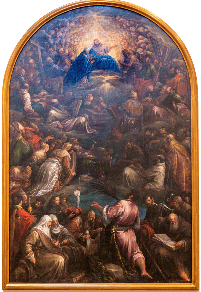 At the top of the painting the Virgin Mary and St. John the Baptist pose as in the Deësis, asking Christ for mercy on the human race. Ranged on their left, right, and below are a multitude of saints.