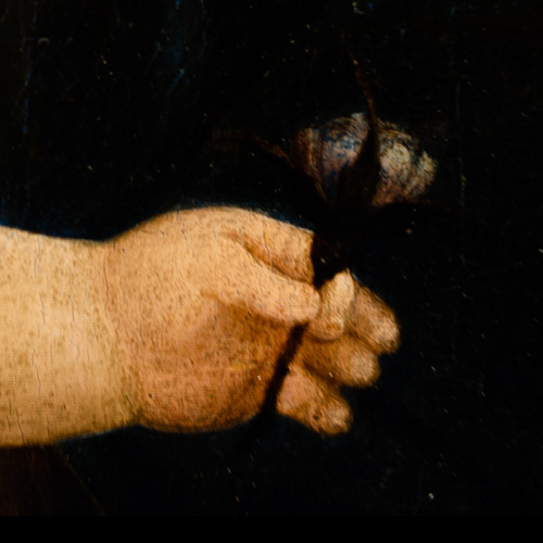 The flower in the baby's hand (see detail photograph below) could be either a thistle or a budding rose. The rose is a conventional symbol of the Virgin Mary. Thistles do not usually figure in paintings of this sort, but their thorns could possibly refer to the crown of thorns that the soldiers placed in Jesus' head.