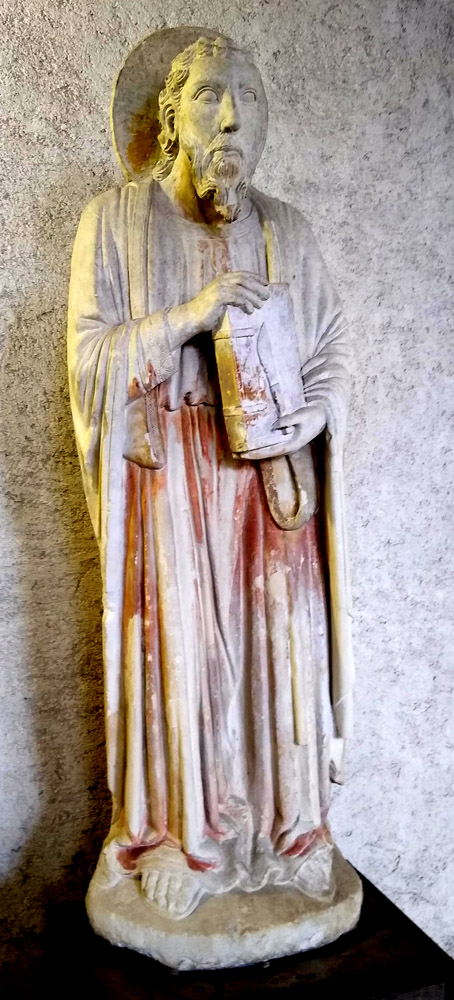 In the restrained style of the master's other works in the museum, a slender St. Bartholomew holds a book and his attribute, a flaying knife. The knife refers to the belief that he was flayed at his execution. The book is a common prop in images of the Apostles and other saints.