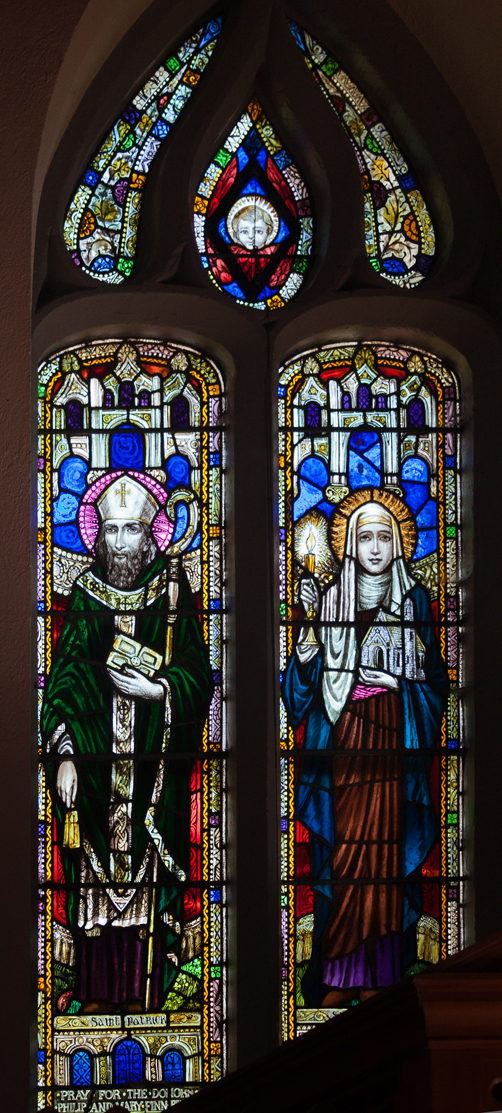 St. Brigid's candle refers to the numerous passages in her legends that associate her with light and fire. She also holds a maquette of Kildare Abbey, which she founded in the 5th century.