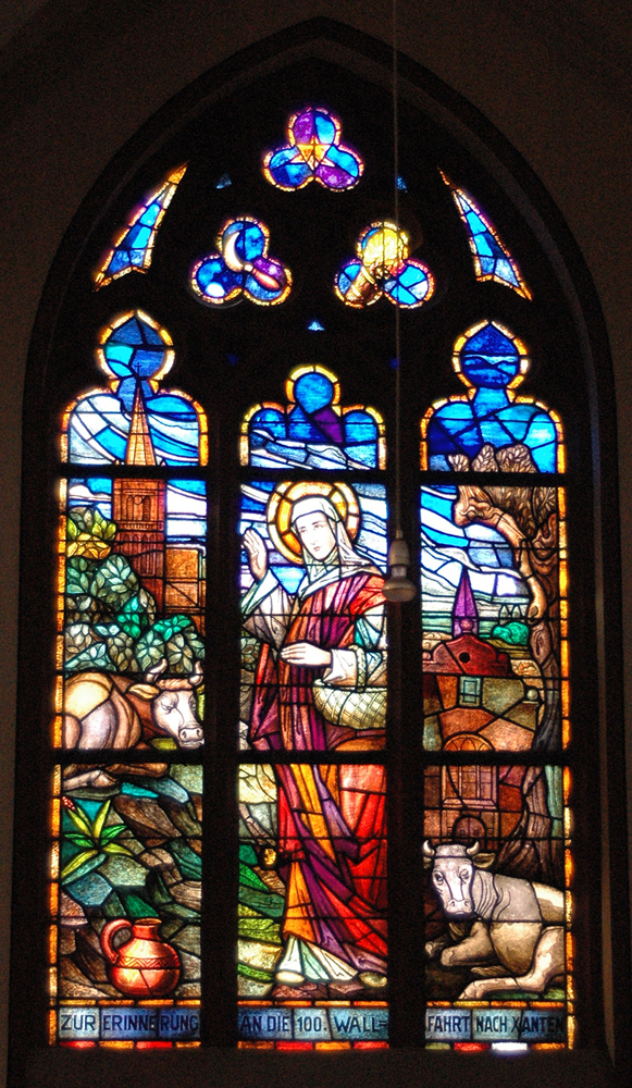 Saint Brigid's most distinctive attribute is a cow, and here we see two. In the lower left is a jug, referring to her many miracles involving milk. Unusually, the artist has omitted the saint's crozier. The church in the upper left very much resembles the