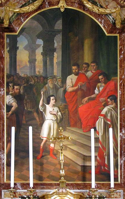 This is one of the few images in which St. Pancras really does look like a 14-year-old. As in the Golden Legend, he stands before the Emperor and denounces the gods as "deceivers and seducers of their own sisters, who spare not even their parents."