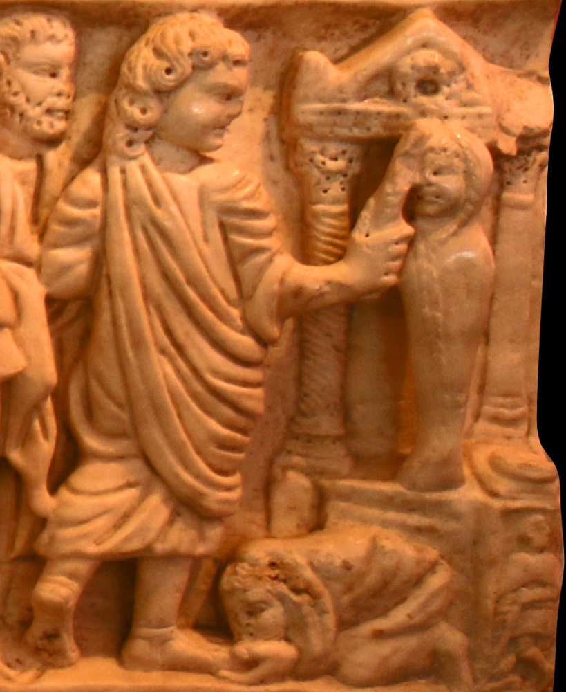 In his right hand Jesus holds a wand, now damaged, signifying his authority. The person at his feet is Lazarus's sister Martha (John 11:20-21). As usual in this period Lazarus is pictured erect in his grave clothes in a tomb shaped like a temple.