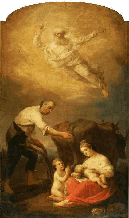 God the Father blesses Isidore's work as a plowman and the holy family life that he and his wife represent. In the legends the couple had only one child, not two, but the prayerful attendance of the older child recalls the countless portraits in which the child John the Baptist looks on as Christ Child lies in his mother's lap. Also, the scene of nursing refers to the many images in which Mary holds the Child to her breast.