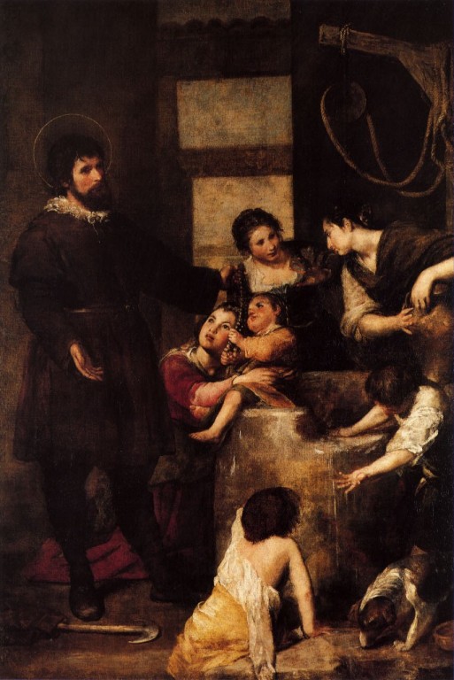 This miracle is related in the Vita of María Torribia, the wife of St. Isidore the Laborer (Acta Sanctorum May vol. 3, 553). Isidore came home from the fields to find his wife sorrowing over their son, who had fallen into a well and drowned. He knelt down with her and joined in begging God that the water would swell up to the top of the well and deliver the child. Their prayers were answered, the water did rise up, and the boy was alive again and safe.