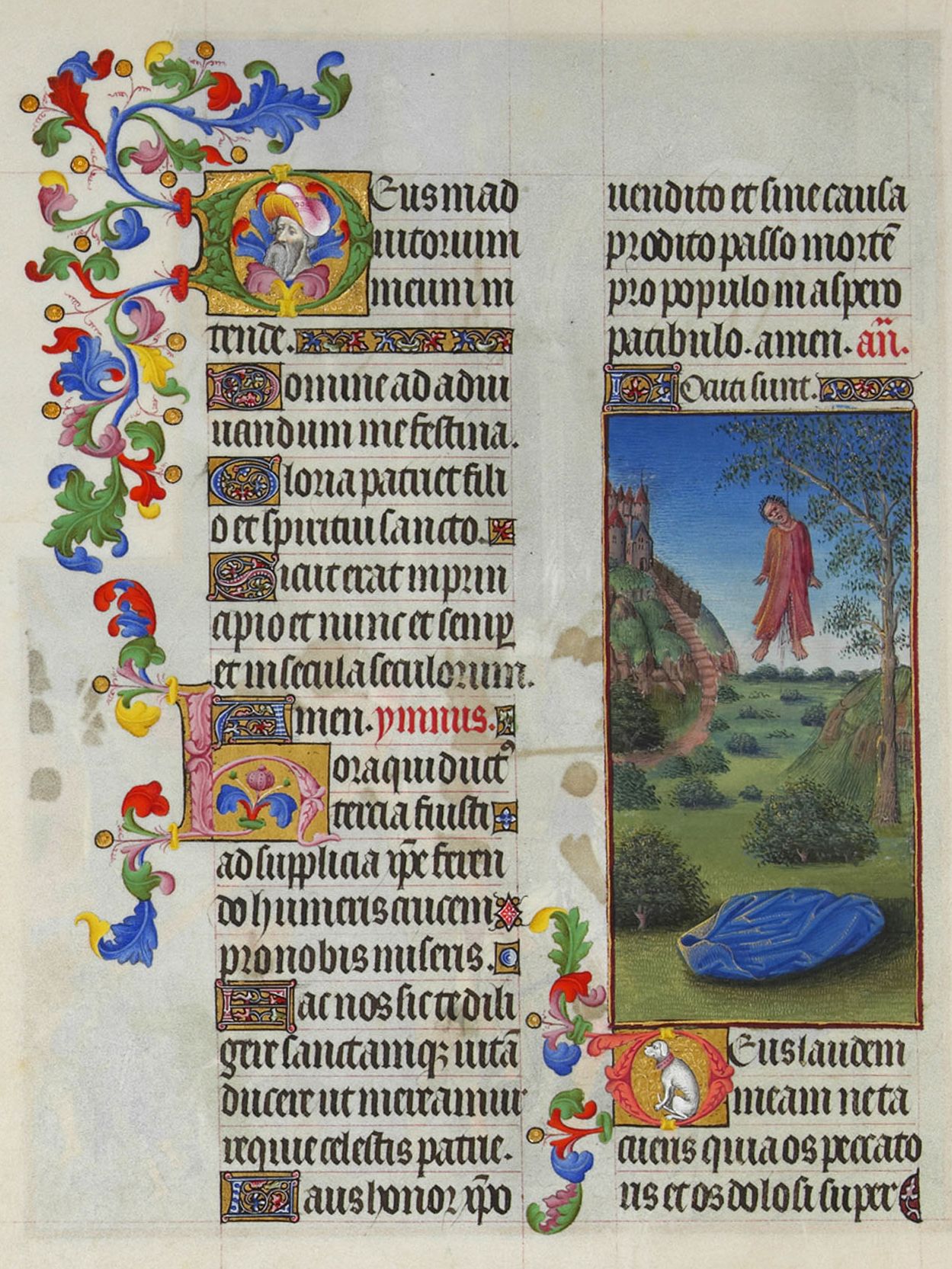 This miniature appears in the "Hours of the Passion" section of the Très Riches Heures. After following Christ's Passion through to the Crucifixion, the text comes to Psalm 108(109), which Christians interpreted as the words of Christ regarding his betrayal by Judas. Directly beneath the image of Judas hanging from a tree, the psalm begins, Deus laudem meam ne tacueris quia os peccatoris et os dolosi super me apertum est, "O God, be not thou silent in my praise: for the mouth of the wicked and the mouth of the deceitful man is opened against me." For St. Jerome the first clause in this verse meant "Judas has betrayed me, the Jews have persecuted me and thought to destroy me; but you, O God, will not be silent," and the second clause leads Jerome to write, "Let us see how the mouth of the traitor Judas is open against the Lord: he comes in order to betray him saying, 'Rabbi.'"1