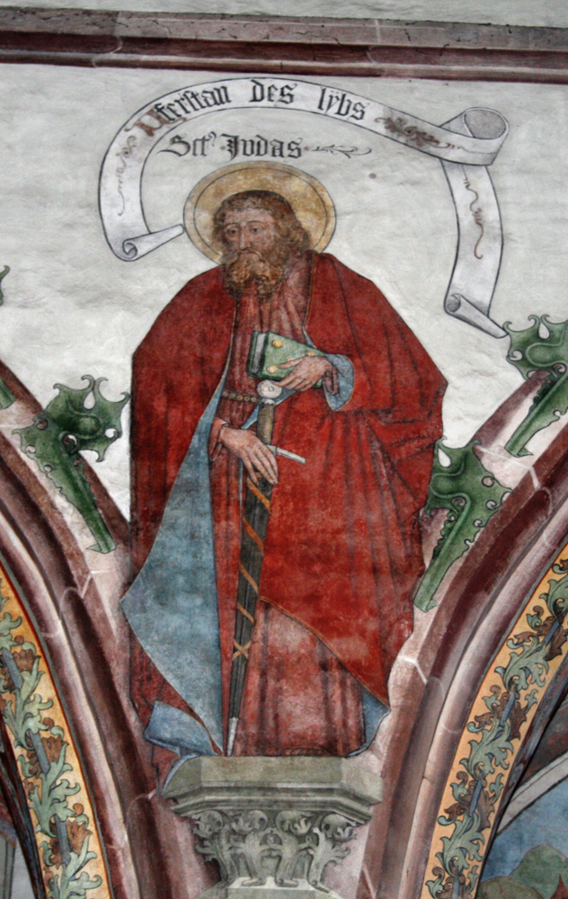 This is one of the few images in which the saint's attribute is a sword. The banderole reads Uferstehn des lÿbs, literally "the overcoming of love" in the sense that love overcomes.