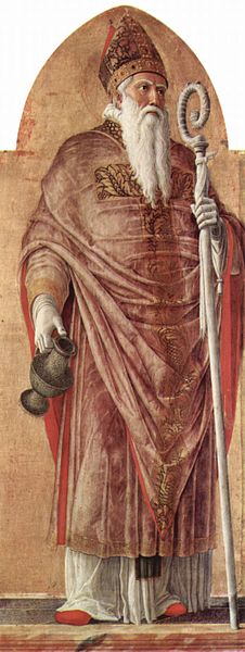 The painting on the right is by Pordenone, 1515. The one on the left is by Mantegna, 1453-54. In both, St. Prosdocimus's attribute is the ewer he used to baptize one of his first converts in Padua, St. Justina. He had been sent to evangelize Padua by St. Peter, so he is pictured as a bishop, with a mitre and crozier in the Mantegna painting and a cope in the Pordenone.
