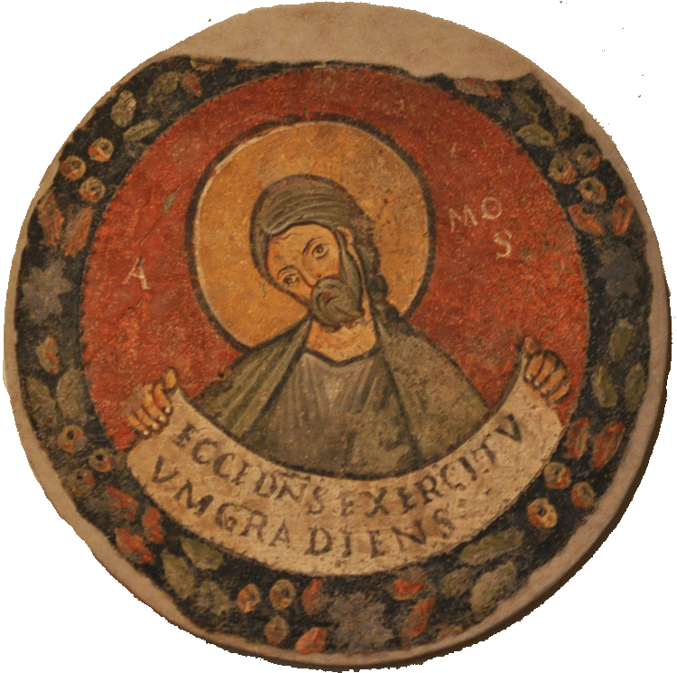 ![]() Amos in a 12th-century fresco fragment. (See the description page.) ![]() Amos in his round hat. (Source: Wikimedia Commons.) ![]() The prophet as pictured in a ceiling panel at Santa Maria Miracoli in Venice (Photo: Richard Stracke, shared under Attribution-NonCommercial-ShareAlike license). DATES